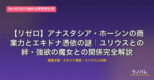 アナスタシア・ホーシンは、リゼロの王選候補者の中で最も「人間的な現実感」を持つキャラクターの一人だ。加護なしに大商会を築き上げた商業的才覚、11年以上にわたる人工精霊・襟ドナとの共生関係、ユリウスへの主従を超えた絆——そのすべてが、Arc5終盤の「エキドナへの身体の譲渡」という決断に凝縮されている。