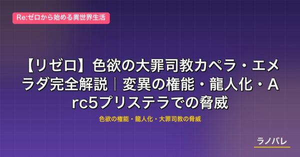 「愛されたい」という歪んだ欲望を哲学にまで昇華させたカペラは、ペテルギウスの狂気的な信仰、レグルスの傲慢な暴力とは異なる個性で物語に強烈な爪痕を残す。本記事では彼女のプロフィール・権能・Arc5での活躍・「ルグニカ」という姓の意味・他の大罪司教との比較まで、原作小説をもとに徹底解説する。