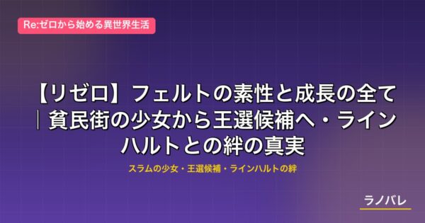 それでも彼女は今、王選の舞台に立っている。本記事では、そんなフェルトという少女の素性・出生の謎・成長の軌跡・そしてラインハルトとの絆の真実を、Arc1から最新章まで時系列で追う。「フェルト完全解説」で明かされた本名・血統・戦闘能力の詳細はそちらに譲り、本記事は「フェルトはいかに変わってきたか」という成長の物語そのものを丁寧に描き出すことに集中する。