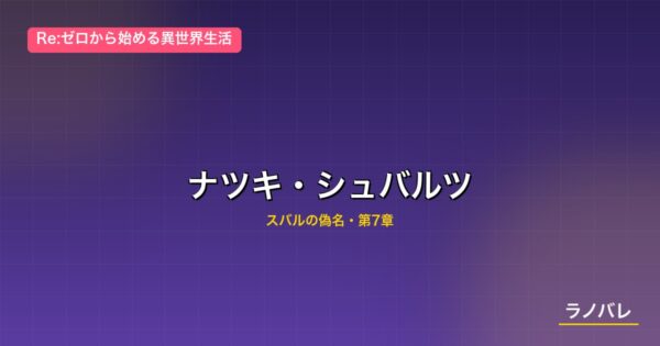 ナツキ・シュバルツは、第七章ヴォラキア帝国編におけるナツキ・スバルの偽名です。単なる呼び名の交換ではなく、スバルが置かれた「身体的・社会的な異常事態」を象徴する、極めて重要な“もうひとつの名”として機能しています。