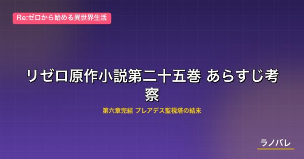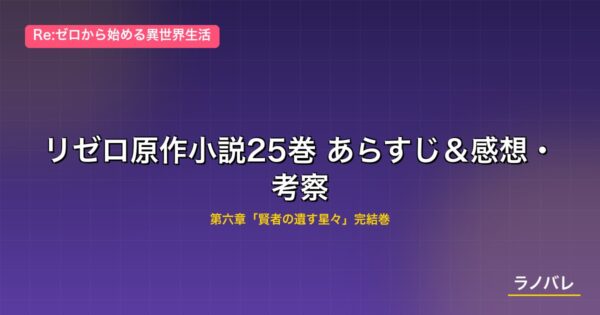 リゼロ25巻は、第六章「賢者の遺す星々」の完結巻として、4年にわたる監視塔編の決着を描く一冊。ライ・バテンカイトスとの因縁の決着、シャウラとの切ない別れ、二人のスバルの合一、そしてレムの目覚め――凝縮された名場面の連続で、リゼロ全シリーズのなかでも特に読み応えのある巻となっている。