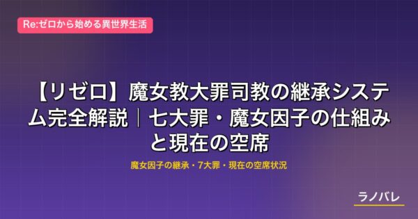 本稿では魔女教の組織構造から大罪司教制度の成り立ち、魔女因子の継承メカニズム、各大罪司教の権能と現在の空席状況に至るまで、原作小説の情報を基に体系的に解説する。